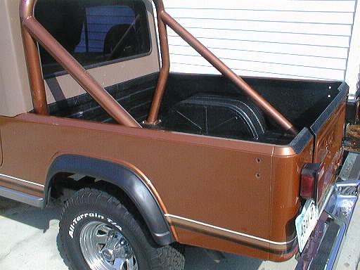 | NOTE: This step is OPTIONAL! Unless you know the rollbar has been taken out, seriously consider performing this step. I took out the rollbar because I have seen several Scramblers with herculiner applied and I thought that the rollbar made it look sloppy because of the way some people applied it halfway up the rollbar. I don't like that, but that's me. Plus I knew there was bad rust where the rollbar mounted and I wanted to take care of it. The roll bar has 16 TORX 45 bolts. Hopefully yours will come out easier than mine. Be careful when you take the rollbar out of the bed, you will have to twist it to get it out of the bed. Grind out all rust where the rollbar mounts and on the 4 mounting feet. Apply POR-15 to mounting feet to be sure the red bandit doesn't come back. |