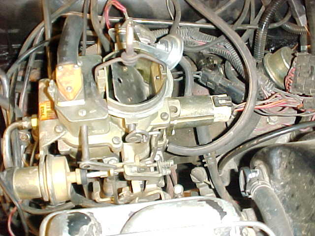| 2. Pull the carburetor assembly off the top of the intake manifold. (Be sure to take lots of notes on how everything connects electric, vacuum, and the linkages. Lots of parts here.) | |