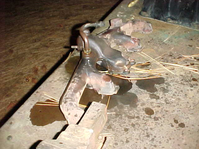 | 8. Remove the exhaust manifold. With it out of the engine compartment, it is much easier to remove that air tube mentioned in step 5 above. I had to use a vice! It wasn't so much that the part was welded to the manifold, it was that the nut (attached to the hot air tube) was "welded" in place and wouldn't spin around the tube. After the tube was removed, I took a little work to free up the nut, but we did it. | |