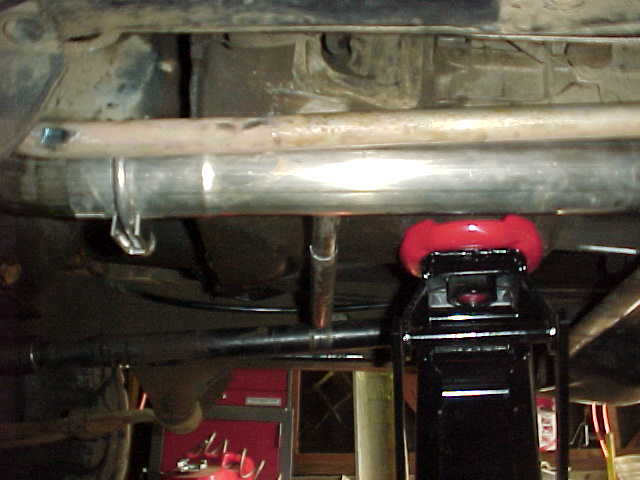 | 10. Remove the exhaust pipe from the front of the catalytic converter. (Removal of the cross member skid plate makes this step easier, block the back of the transmission first, before removing the skid plate.) Sometimes, you may find it is also easier to remove the muffler and tailpipe mounts from the bottom of the body to gain more movement. | |